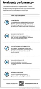 Vor diesem Hintergrund hat Die Stuttgarter mit ihrer neuen Fondsrente performance+ ein kapitalmarktorientiertes Produkt entwickelt, das den Spagat schafft und allen Anforderungen an eine zeitgemäße Altersvorsorge gerecht wird – und zwar in allen Lebenslagen. performance+ investiert dauerhaft einen möglichst hohen Anteil der Sparbeiträge in Fonds, wobei die Sparer die Möglichkeit haben, den Fokus entweder mehr auf Sicherheit oder mehr auf Renditechancen zu legen.