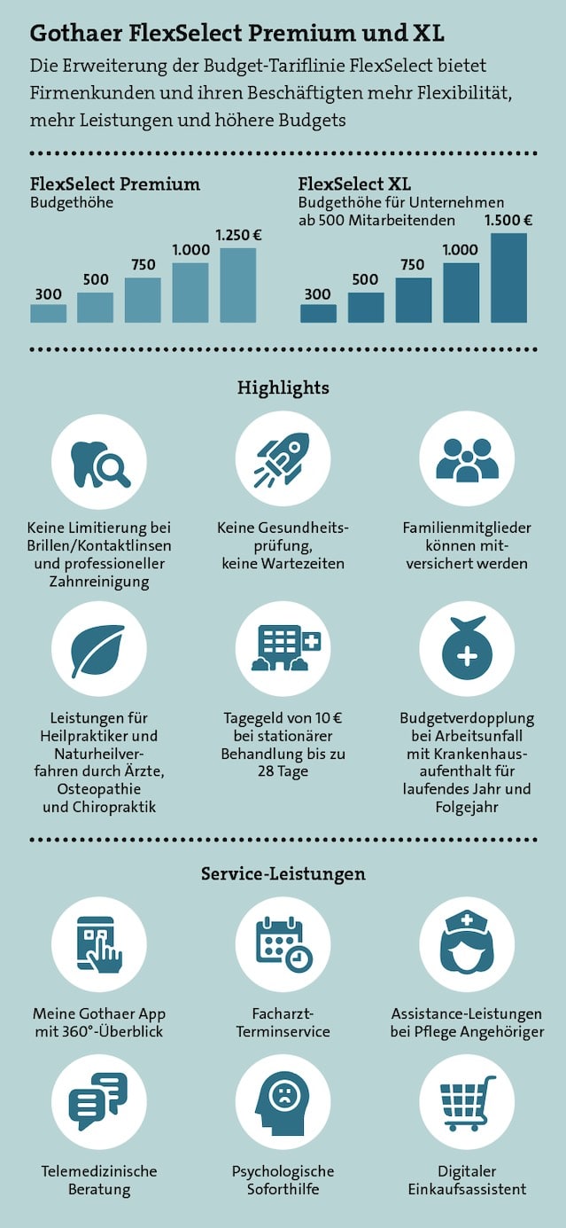 Während sich FlexSelect Premium an Betriebe mit fünf oder mehr Mitarbeitern richtet, ist der XL-Tarif speziell für Unternehmen ab 500 Beschäftigten gemacht. Durch die höhere Anzahl an Versicherten kann die Gothaer hier besonders günstige Beiträge anbieten, etwa von 17,70 Euro pro Monat und Mitarbeiter bei einer Budgethöhe von 500 Euro.