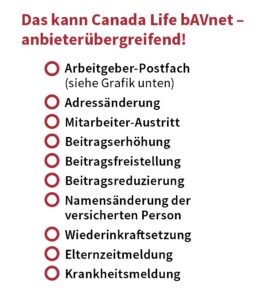 Ein weiterer Vorteil: Canada Life bAVnet funktioniert anbieterübergreifend. Man kann neben der Canada Life-Betriebsrente GENERATION business im Durchführungsweg Direktversicherung auch Verträge anderer Anbieter mit einem Login verwalten.