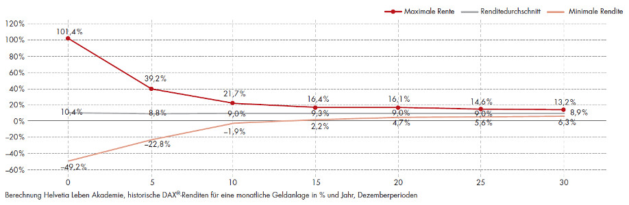 Eines ist allerdings aus unserer Sicht überflüssig – eine feste Garantie. Sie kostet Rendite und ist eine Gefahr für die Zielerreichung in der Altersvorsorge. Helvetia hat die DAX®-Renditen verschiedener 30-Jahres-Zeiträume untersucht. Eines wurde dabei deutlich: Je länger der Sparvorgang anhält, desto wahrscheinlicher ist eine positive Rendite – selbst bei ungünstigen Verläufen. Eine lange Laufzeit und eine breite Streuung bieten somit ein gewisses Maß an Sicherheit, das Krisen und Kurseinbrüche in den Hintergrund rücken lässt (Grafik vergrößern).