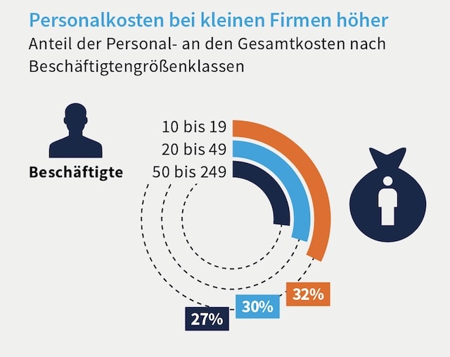 Ein weiterer erfolgversprechender Vertriebsansatz setzt bei den Personalkosten an. Je nach Unternehmensgröße entfallen zwischen einem Viertel und einem Drittel der Gesamtkosten auf das Personal (siehe Grafik). Dazu kommt, dass der zunehmende Arbeitskräftemangel ebenso wie die hohe Inflation zu einem wachsenden „Lohndruck“ für viele kleine und mittlere Unternehmen führt.
