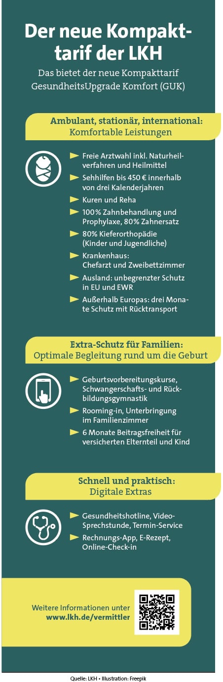 Vor nicht einmal einem Jahr hat die LKH die vielfach ausgezeichnete private Krankenvollversicherung GesundheitsUpgrade Premium (GUP) gestartet. Jetzt legen die Niedersachsen mit einem günstigen Kompakttarif eindrucksvoll nach: dem GesundheitsUpgrade Komfort, kurz GUK. „Der GUK komplettiert nun unsere GesundheitsUpgrade-Produktlinie und bietet als preiswerte Alternative ein hervorragendes Preis-Leistungs-Verhältnis“, sagt Pavel Berkovitch, im LKH-Vorstand für die Produktentwicklung verantwortlich.