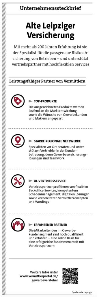 Als solide Service-Basis bringt die Alte Leipziger mehr als 200 Jahre Erfahrung im Versicherungsgeschäft mit. Auf diese gewachsene Kompetenz können sich Versicherungsvermittler verlassen. Sie sind nicht allein. Ganz im Gegenteil: In enger Teamarbeit mit Experten der Alte Leipziger können sie flexibel und schnell auf veränderte Kundenanforderungen reagieren und Betrieben neben hochwertigen Standardlösungen auch maßgeschneiderte, laufend aktualisierte Sicherheitskonzepte anbieten.
