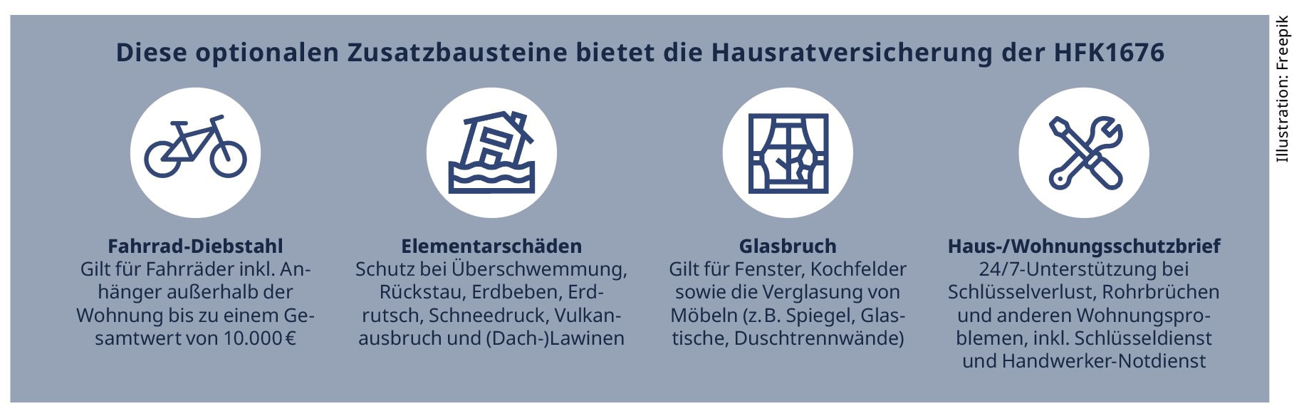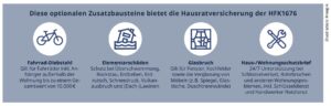 „Unsere Hausratversicherung bietet mit den optionalen Zusatzbausteinen Fahrrad-Diebstahl, Elementar, Glasbruch sowie dem Haus- und Wohnungsschutzbrief als auch einer umfassenden Premium-Grundabsicherung ein flexibles und leistungsstarkes Angebot, das sich an die unterschiedlichen Kundenbedürfnisse anpasst“, ergänzt Jasmin Hafner. Einen Überblick über diese Zusatzbausteine liefert der Kasten.
