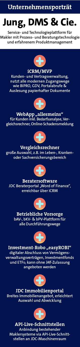 Wer heute und künftig als Versicherungsmakler erfolgreich sein will, benötigt Zugriff auf moderne Vertriebstechnologien und einen erfahrenen Partner, der bei der Anwendung und Weiterentwicklung unkompliziert unterstützt. Als Maklerpool und Plattformtechnologie-Dienstleister bietet Jung, DMS & Cie. alle wichtigen technischen Verfahren für die Beratung und Vermittlung (siehe Kasten unten) plus ein professionelles Backoffice.