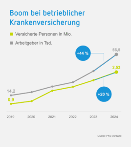 Alles in allem Faktoren, die die Entwicklung und den Wachstumsboom der bKV im Jahr 2024 erklären und durch die Zahlen des PKV-Verbandes bestätigt werden. Mittlerweile haben 56.500 Unternehmen in Deutschland für ihre Belegschaft eine komplett vom Arbeitgeber finanzierte betriebliche Krankenversicherung eingeführt. Durch das Plus von 43,8 Prozent gegenüber den Vorjahrszahlen profitieren somit 2,53 Millionen Beschäftigte von den Gesundheitsleistungen einer betrieblichen Krankenversicherung.