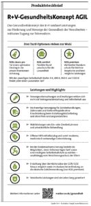 Das Motto der R+V ist: „Du bist nicht allein“. Das leben wir auch in unseren Produktlösungen. Statt ständig Tarife mit dem neuesten „Schnickschnack“ einzuführen, sind wir an den Stellen besonders leistungsfähig, wo der Kunde uns wirklich braucht. Mit unserer Vollversicherung AGIL haben wir ein solides und faires Tarifwerk, das für jeden Bedarf eine passende Lösung parat hat. Wir bieten unseren Versicherten einen schnellen Zugang zur innovativen Telemedizin, Vorsorgeuntersuchungen, die sich nicht auf die Beitragsrückerstattung und den Selbstbehalt auswirken, sowie eine unkomplizierte und schnelle Leistungserstattung. Dabei bietet unser GesundheitsKonzept AGIL seit Einführung 2009 nicht nur dauerhaft hervorragende Leistungen, sondern weist auch eine geringe durchschnittliche Beitragsanpassungshöhe auf. Das gilt auch für das BeihilfeKonzept.