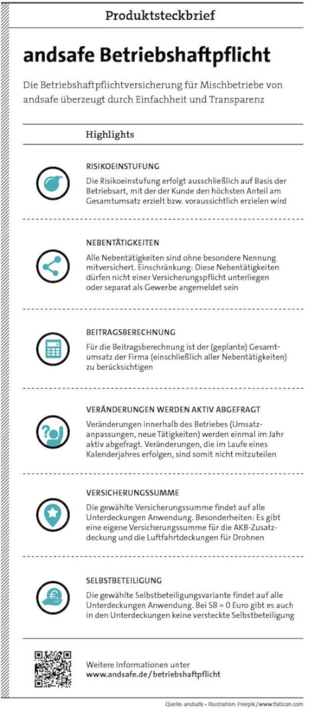 Die Risikoeinstufung nach der umsatzstärksten Betriebsart, bei der alle anderen branchenüblichen Betriebsarten mitversichert sind, stellt die größte Neuerung in unserer Betriebshaftpflichtversicherung dar. Die Absicherung von Mischbetrieben in dieser Art gibt es so bei keinem anderen Versicherer. Bei uns spielt es keine Rolle, ob der Maler eben auch Trockenbau anbietet. Wenn seine Haupteinnahmequelle in der Regel der Malerbetrieb ist, wird er in dieses Risiko einsortiert.
