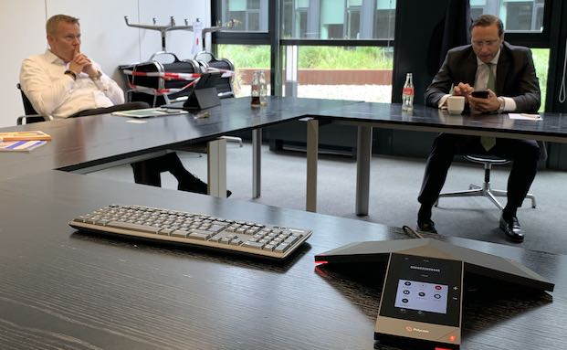 HDI-bAV-Experte Fabian von Löbbecke (links) und Thomas Lüer, Vorstand HDI Vertriebs AG, bestreiten das 13. HDI bAV-Expertenforum von einem Konferenzraum aus in der Kölner HDI-Zentrale.