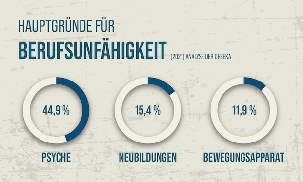 Laut Debeka ist der Anteil des Bewegungsapparates als Ursache für Berufsunfähigkeit im Vergleich zum Vorjahr um 2,2 Prozentpunkte (von 2020 insgesamt 14,1 Prozent) auf 11,9 Prozent gesunken. Neubildungen, also bösartige und gutartige Tumore, als Grund haben ebenfalls leicht abgenommen, um 1,5 Prozentpunkte auf 15,4 Prozent (von 2020 insgesamt fast 16,9 Prozent).
