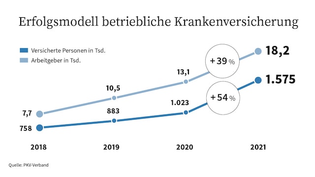 Das entspricht einem Wachstum von 38,9 Prozent gegenüber dem Jahr 2020 (13.100 Betriebe). Die Zahl der Beschäftigten, die von einer bKV profitieren, stieg um 54 Prozent von 1,02 Millionen (2020) auf 1,58 Millionen Personen (2021).