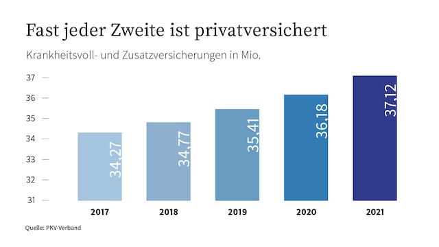 Die Zahl der Verträge in der privaten Krankenversicherung ist im vergangenen Jahr auf 31,1 Millionen gestiegen. Bei den Zusatzversicherungen ging es um 3,5 Prozent auf 28,4 Millionen Verträge nach oben. In der Vollversicherung verbuchten die Anbieter ein leichtes Minus von 0,1 Prozent – nach Abzug der Sterbefälle belief sich die Zahl der Verträge 2021 auf 8,7 Millionen.