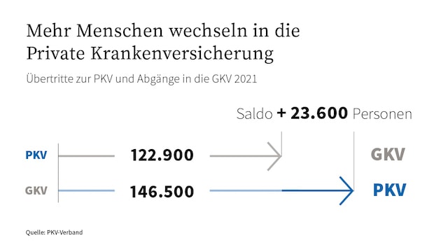 Konkret entschieden sich im vergangenen Jahr 146.500 Personen für einen Wechsel aus der GKV in die PKV. Umgekehrt wechselten 122.900 Personen. Die Abgänge in die GKV erfolgen meistens unfreiwillig, heißt es vom PKV-Verband. „So mussten auch 2021 wieder tausende seit Geburt privatversicherte junge Leute beim Eintritt ins Berufsleben gezwungenermaßen in die GKV wechseln. Derselbe Effekt betraf tausende Selbstständige bei Aufnahme einer sozialversicherungspflichtigen Beschäftigung“, führt der Verband aus.