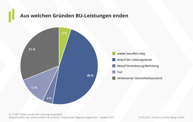 Erstmalig wurde im Rahmen der Studie bei knapp 22.000 Leistungsfällen auch ausgewertet, aus welchen Gründen die BU-Leistung endet. Das Ergebnis: In knapp 50 Prozent der Fälle wurde die BU-Rente bis zum Ablauf der Leistungsdauer gezahlt. Bei rund 36 Prozent verbesserte sich der Gesundheitszustand oder es erfolgte die Aufnahme einer zum Gesundheitszustand passenden Tätigkeit. Der Tod der versicherten Person führte in 12 Prozent der Fälle zu einer Leistungseinstellung.