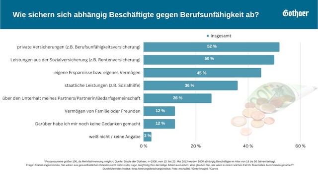 Wie sorgen Erwerbstätige für den Fall der Fälle vor? Jeweils die Hälfte der Befragten setzt auf eine private Absicherung, beispielsweise auf eine Berufsunfähigkeitsversicherung (52 Prozent), oder auf Leistungen aus der Sozialversicherung, wie der Rentenversicherung (50 Prozent). 45 Prozent sehen sich durch eigene Ersparnisse oder eigenes Vermögen abgesichert, 36 Prozent durch staatliche Leistungen wie Sozialhilfe.