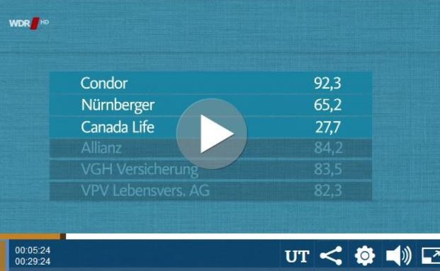 Weiter mit dem Film: „Die Nürnberger liegt mit 65 Prozent im unteren Mittelfeld. Am besten schneidet noch die Condor ab mit 92,3 Prozent Leistungsquote“, so der Reporter.