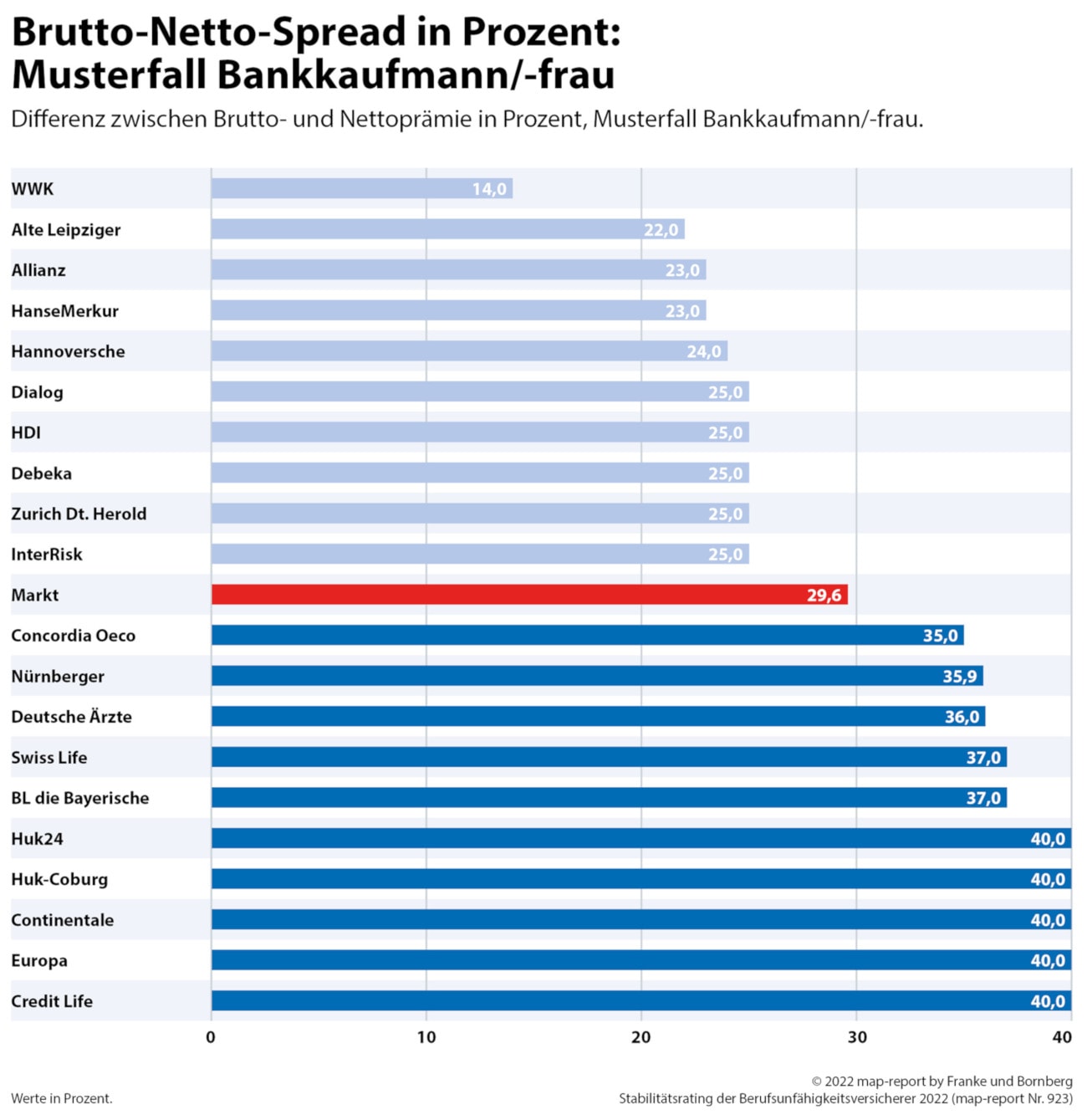 Ein Indikator ist für die Analysten die Spanne zwischen Brutto- und Nettobeiträgen. Wobei ersterer den tatsächlichen Preis für den Versicherungsschutz bedeutet. Der Nettobeitrag hingegen weist das aus, was der Kunde zahlt. Gutgeschriebene Sofortüberschüsse machen es möglich. Nur: Wenn die Spanne besonders groß ist, kann der Anbieter die tatsächlich gezahlte Prämie besonders stark steigen lassen. Nämlich indem er den Überschuss kürzt. Ein Umstand, der die Franke-und-Bornberg-Analysten nachdenklich stimmt. Im Durchschnitt beträgt der Brutto-Netto-Spread am Markt rund 30 Prozent (2016 lag er noch bei 36 Prozent). Einige Anbieter zeigt die folgende Grafik. Das gibt einigen Spielraum für steigende Prämien.