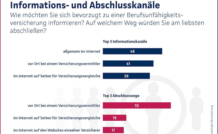 Beim Abschluss einer Berufsunfähigkeitsversicherung (BU) geht nichts über den persönlichen Kontakt – das gilt selbst für junge Menschen zwischen 18 und 29 Jahren: Gut die Hälfte der Angehörigen der Generation Z geben den „Vermittler vor Ort“ als bevorzugte Option für einen Vertragsabschluss an (45 Prozent), nur jeder fünfte bevorzugt Vergleichsportale (19 Prozent).