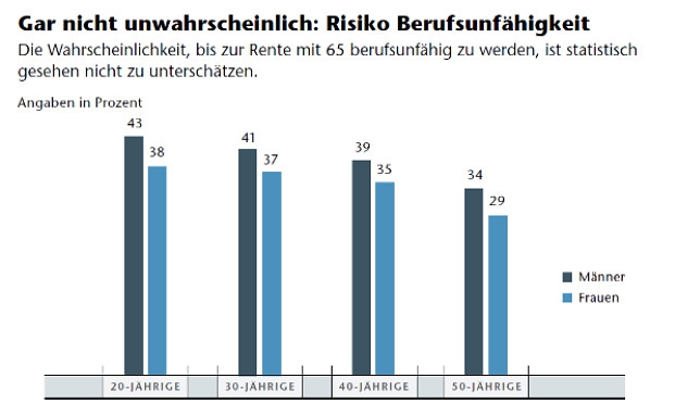 Erschreckend sind die Ergebnisse einer Umfrage des Versicherers Canada Life: 60 Prozent der Deutschen sind gar nicht abgesichert, 20 Prozent der Menschen mit Berufsunfähigkeitsversicherung wissen nicht, ob die versicherte Rente ausreicht.