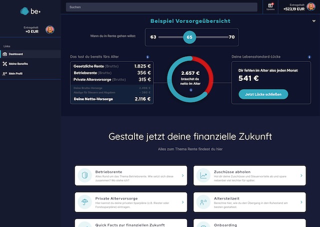 Wir ermöglichen den Mitarbeitern eines Unternehmens, die angebotenen Benefits in Anspruch zu nehmen, indem wir diese Vorzüge für jeden verständlich und einfach nutzbar auf einer Plattform und einer App zugänglich machen. Dazu gehören zum Beispiel alle Fakten zur Betriebsrente, die digitale Gehaltsabrechnung, aber auch die Weiterbildungsmöglichkeiten und das Food-Angebot rund um den Standort des Unternehmens. Bisher muss der Arbeitnehmer diese Informationen noch mühsam aus dem Intranet, von Aushängen am schwarzen Brett oder von irgendwelchen Laufwerken zusammensuchen. Mit be+ sind alle diese Infos jederzeit verfügbar und der Arbeitnehmer kann sich zusätzlich informieren. Er kann über be+ etwa seine individuelle Versorgungslücke berechnen, seine Gehaltsumwandlung digital anpassen oder auch eine zusätzliche private Altersvorsorge abschließen.