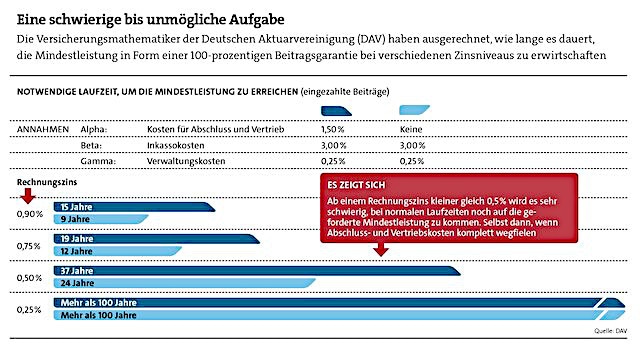 Zum Jahreswechsel ist der Höchstrechnungszins in der Lebensversicherung von 0,90 auf 0,25 Prozent gesunken. Das ist schon ein Klopper. Insbesondere Produkte mit Garantien stellt das vor große Probleme, weil die Garantien zu solchen Zinsen ein Verlustgeschäft sind – für Versicherer und Sparer (siehe Grafik). Nun schreibt der Gesetzgeber in manchen Altersvorsorge-Lösungen aber Garantien vor – etwa in der betrieblichen Altersversorgung (bAV).