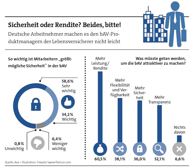 Doch mit derlei Abgesängen auf Direktversicherung und Co. dürfte Baier unter Versicherungsmanagern auf vehementen Widerstand stoßen. Und auch die Experten des Wirtschaftsprüfungs- und Beratungsunternehmens Deloitte gehen in ihrer jüngsten Marktuntersuchung davon aus, dass die bAV insgesamt – also auch die versicherungsförmige Variante – „mit ihren Attributen Nachhaltigkeit, Fürsorge und Sicherheit langfristig auf einen steigenden Bedarf“ treffen werde.