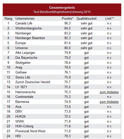 Bester BU-Anbieter im Test ist die Canada Life. Auf den Plätzen zwei und drei folgen Württembergische und Nürnberger.