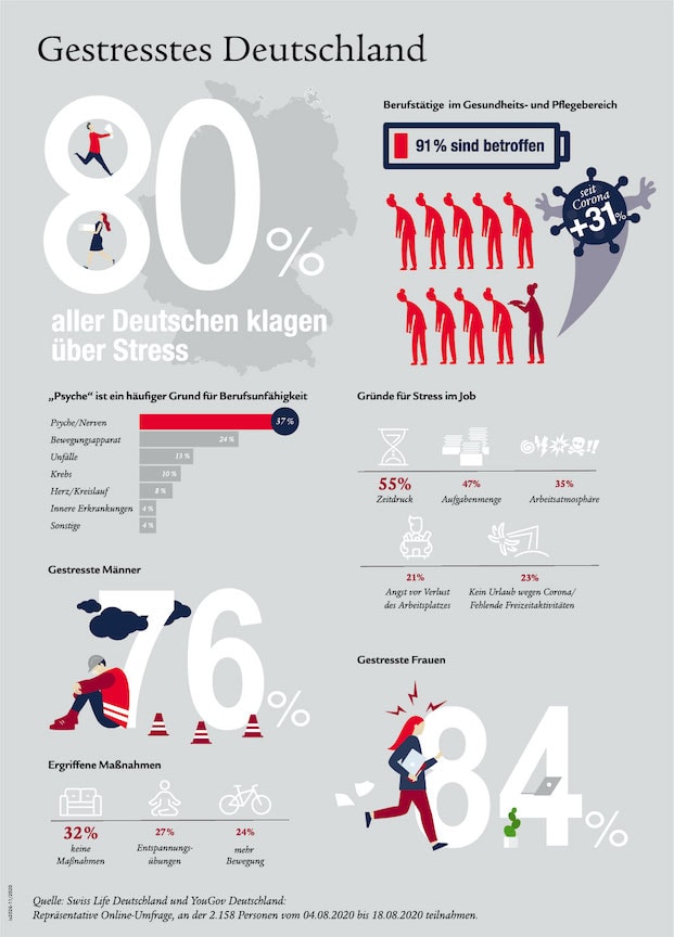 Deutschland ist gestresst – so lautet das zentrale Ergebnis der „Stress-Statistik“, die der Finanzdienstleister Swiss Life veröffentlicht hat. Insgesamt litten 80 Prozent der Bundesbürger in den vergangenen Monaten darunter (siehe Grafik). In der Gesundheits- und Pflegebranche trifft das auf besonders viele Menschen zu: Hier erklärten 91 Prozent der Beschäftigten, in den vergangenen Monaten Stress verspürt zu haben – ein Drittel davon deutlich häufiger seit dem Ausbruch der Corona-Pandemie (31 Prozent).