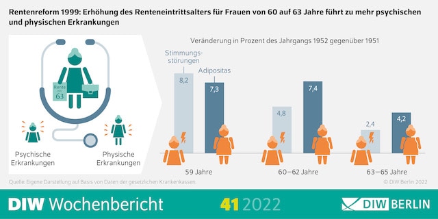 Anhand einer Rentenreform aus dem Jahr 1999 konnte das Institut nachweisen, dass sich der gesundheitliche Zustand verschlechtert, wenn Menschen erst später in den Ruhestand gehen können. Das gelte vor allem mit Blick auf psychische Krankheiten wie Stimmungsstörungen, aber auch mit Blick auf körperliche Erkrankungen, beispielsweise Übergewicht und Arthrose.