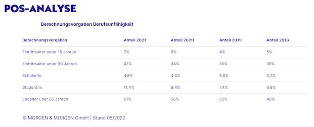 Laut aktueller „Point-of-Sale“-Daten, die Morgen & Morgen zufolge auf mehr als eine halbe Million anonymisierter Berechnungen aus den letzten zwölf Monaten beruhen, zeige sich ein deutlicher Trend hin zu jungen Versicherungsnehmerinnen und -nehmern. „Es werden vermehrt Schüler und Schülerinnen, Azubis und Studentinnen und Studenten sowie Alter unter 30 Jahren berechnet“, kommentiert Analyst Ludwig die Entwicklung (siehe Grafik). Das sei „ein erfreulicher Trend“, so Ludwig, denn die beste BU sei die, „die man gestern abgeschlossen hat“. Weiterhin sei zu erkennen, dass das Endalter in den Berechnungen höher gewählt und immer häufiger auf über 65 Jahren angesetzt werde.