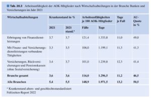 Schaut man sich die krankheitsbedingten Fehlzeiten nach Branchen im Jahr 2021 an, so zeigt sich, dass die Branche „Banken und Versicherungen“ unterdurchschnittliche Fehlzeiten aufweist. Hier lagen die Arbeitsunfähigkeiten je 100 AOK-Mitglieder bei 116,0 Fällen – über alle Wirtschaftsbranchen betrachtet sind es 148,9 (siehe Tabelle). Betrachtet man allein die Versicherungen, Rückversicherungen und Pensionskassen (ohne Sozialversicherung) sind es sogar nur 101,0 Fälle.