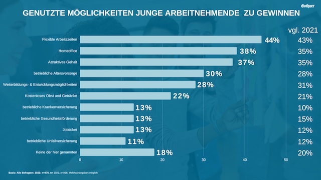 Ein weiteres Ergebnis der Umfrage: Untätig sind die deutschen Firmen nicht, wenn es um ihre Attraktivität als Arbeitgeber geht. Auf Platz 1 der genutzten Möglichkeiten, um junge Arbeitnehmende zu gewinnen: flexible Arbeitszeiten. 44 Prozent der befragten Unternehmen setzen auf Vereinbarungen, die beim Arbeitszeitrahmen von der sogenannten Normalarbeitszeit abweichen. 38 Prozent bieten die Möglichkeit, von zu Hause zu arbeiten an. Knapp dahinter reihen sich attraktive Gehaltszahlungen (37 Prozent) ein.