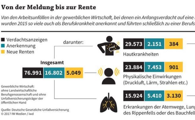 Vor allem im Bereich „Hautkrankheiten“ klafft zwischen Beantragung und Rente eine gigantische Lücke: Aus gut 30.000 Anträgen resultierten rund 2.150 Anerkennungen (7,3 Prozent) und 384 neue Rentenzahlungen (1,3 Prozent). Deutlich höher sind die Chancen im Bereich „Physikalische Einwirkungen“ (allen voran Lärm) sowie „Erkrankung der Atemwege“: Von fast 24.000 Verdachtsanzeigen aufgrund von Lungen- oder Rippen-/Bauchfellbeschwerden mündeten rund 7.450 in eine Anerkennung (34 Prozent) sowie daraus folgend in 3.130 Fällen in eine Rente (19,7 Prozent).