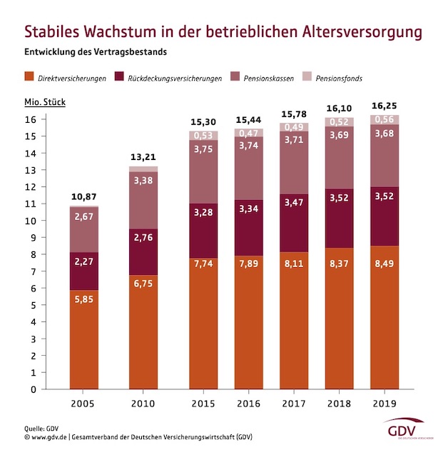 Die Zahl der Verträge in der betrieblichen Altersversorgung (bAV) hat im vergangenen Jahr um 150.000 auf rund 16,3 Millionen zugelegt, wie der Versicherungsverband GDV meldet. Demnach habe insbesondere die Direktversicherung durch das Betriebsrentenstärkungsgesetz „neuen Schub bekommen“. Deren Zahl wuchs um 1,4 Prozent auf rund 8,5 Millionen Verträge.