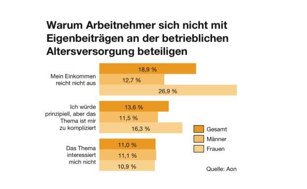 Fast zwei Drittel der Männer (65 Prozent) und nicht einmal die Hälfte (46 Prozent) der Frauen legt Geld in eine Betriebsrente an. Dass sich nach wie vor viele Menschen gegen die betriebliche Altersversorgung entscheiden, hat seine Gründe. Nummer 1: Das Einkommen ist zu gering. Nummer 2: Die Vorsorge ist zu kompliziert. So äußerten sich in einer repräsentativen Umfrage des Beratungs- und Dienstleistungsunternehmens Aon Hewitt Arbeitnehmer von Großunternehmen mit mehr als 10.000 Beschäftigten.