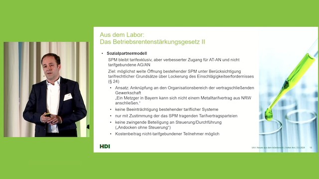 Als nächstes übernahm Volker Ars, Leiter Recht und Grundsatzfragen HDI Pensionsmanagement, das Rednerpult und berichtete über Neuerungen und Herausforderungen im bAV-Arbeitsrecht.