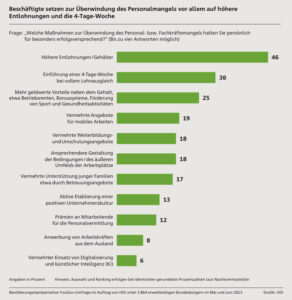 Als beste Maßnahme für Unternehmen, sich im Wettbewerb, um Personal durchzusetzen, nennen die Beschäftigten eine höhere Entlohnung (46 Prozent), die Einführung der 4-Tage-Woche mit vollem Lohnausgleich (30 Prozent) und Benefits neben dem Gehalt wie Betriebsrenten oder Bonussysteme (25 Prozent).