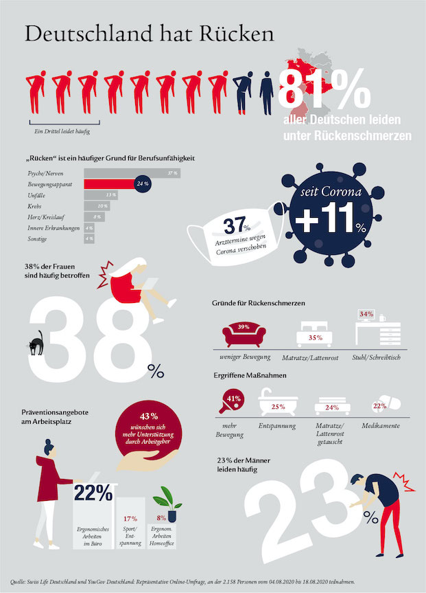 Die Gründe für diese Entwicklung hängen offenbar unmittelbar mit der Pandemie und der Zunahme der Heimarbeit zusammen. So gaben 39 Prozent der Befragten an, dass mangelnde Bewegung schuld an ihrem Leiden sei. 34 Prozent führen ihre Beschwerden auf einen schlechten Bürostuhl oder Schreibtisch zurück. Und 37 Prozent erklärten, dass sie aus Angst vor einer Infektion nicht zu ihrem Arzt gegangen seien.