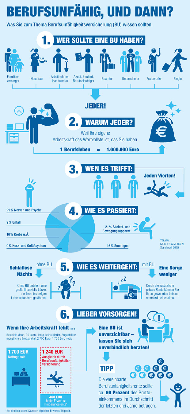 Die eigene Arbeitskraft ist das wichtigste Kapital überhaupt. Mit dem eigenen Einkommen zahlt man Miete, die Ausbildung der Kinder, den Urlaub, lieb gewonnene Hobbys und, und, und. Aber was, wenn das Einkommen plötzlich wegbricht, weil man nicht mehr arbeiten kann. Unsere Infografik der Woche fasst hübsch zusammen, warum sich eine BU-Versicherung für fast jeden lohnt.
