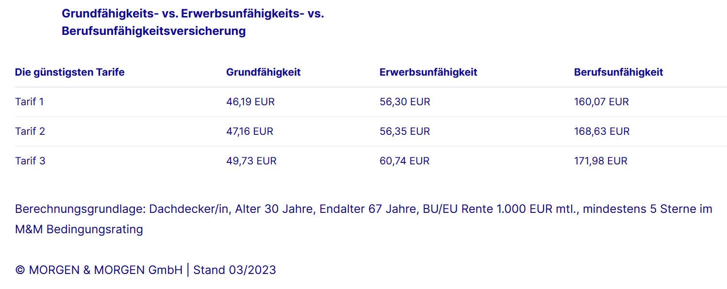 Weiter geht es mit der bereits erwähnten Frage, ob hart körperlich Arbeitende diese Tarife überhaupt bezahlen können. Schließlich ist die reine BU-Versicherung für sie oft zu teuer. Somit haben die Analysten ein Beispiel durchgerechnet: 30-jähriger Dachdecker, Endalter bei 67 Jahren, eine Rente von 1.000 Euro im Monat und mindestens fünf Sterne im Rating. Welche Indikation dabei herausgekommen ist, zeigt die folgende Grafik: