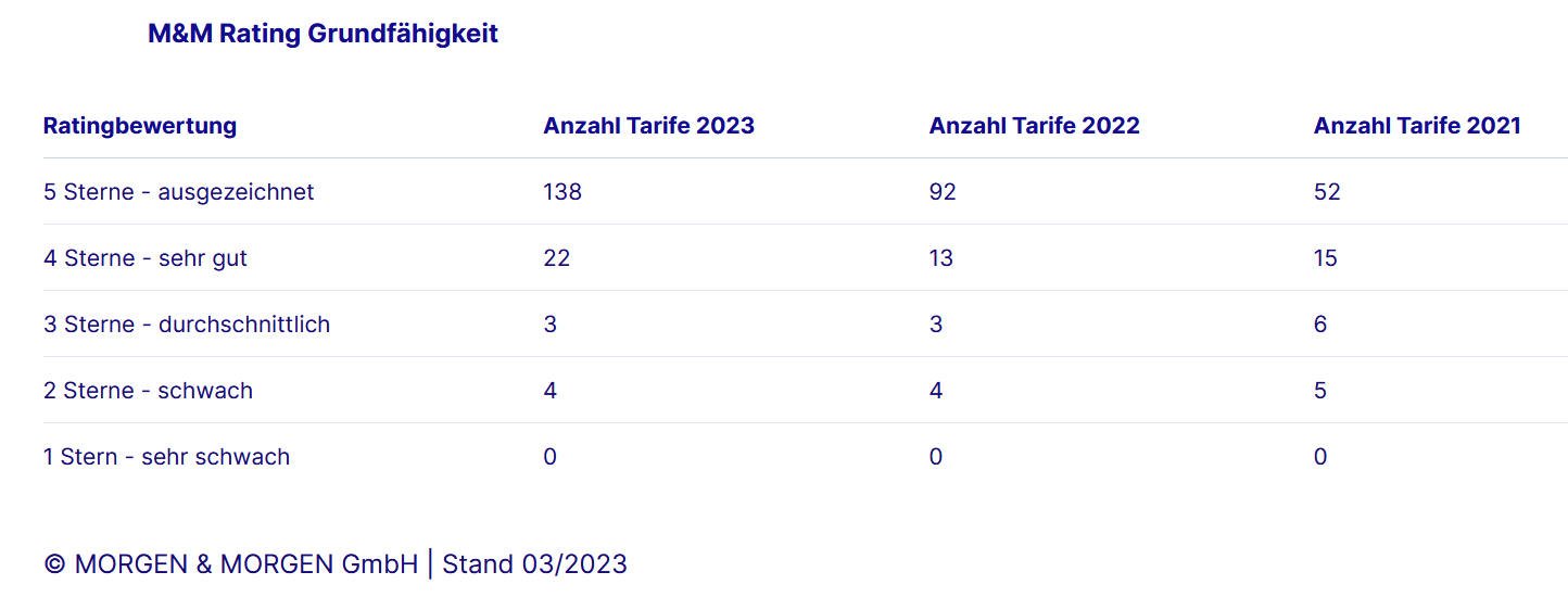 Das Angebot an Grundfähigkeitsversicherungen wächst derzeit stark. Und die neuen Tarife können sich absolut sehen lassen, stellen die Analysten von Morgen & Morgen (M&M) in ihrem aktuellen „M&M Rating Grundfähigkeit“ fest. 167 Tarife zählen sie dabei inzwischen. Im vergangenen Jahr waren es noch 112 und 2021 nur 78.