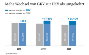 Im vergangenen Jahr sind 21.400 Menschen mehr von der gesetzlichen in die private Krankenversicherung (PKV) gewechselt als andersherum. Das meldete der PKV-Verband in Berlin. Demnach entschieden sich 144.800 Personen für einen Wechsel aus der gesetzlichen Krankenversicherung (GKV) in die PKV. Umgekehrt wechselten 123.400 Personen in die GKV. Damit sind das dritte Jahr in Folge wieder mehr Menschen in die PKV gekommen, als sie in die GKV abgewandert sind. 2018 waren es 800 Versicherte mehr, 2019 bereits 17.400 und nun 21.400.