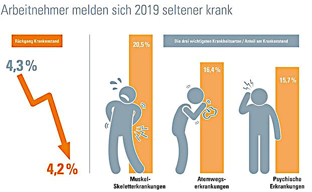 Rückenleiden und andere Muskel-Skelett-Erkrankungen stehen dabei an erster Stelle der Gründe für die Krankmeldungen. Jeder fünfte Fehltag ist darauf zurückzuführen (20,5 Prozent). Bei Männern machen diese Diagnosen einen größeren Anteil am Krankenstand aus als bei Frauen (22,5 und 18,5 Prozent). Danach folgen Krankheiten des Atmungssystems mit 16,4 Prozent.