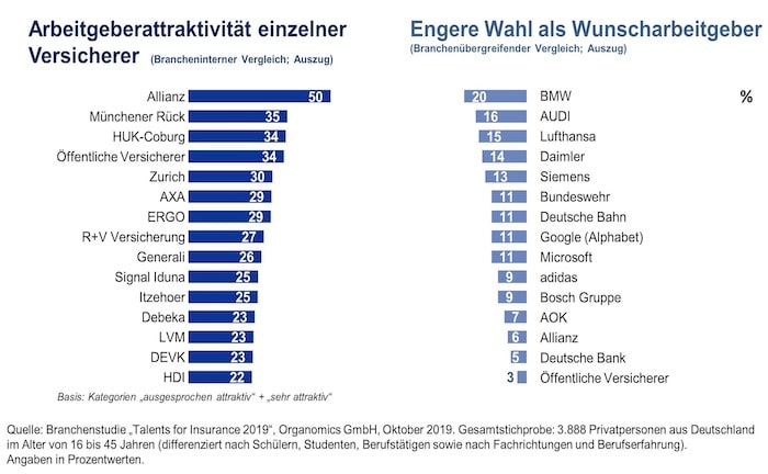 Schlusslichter unter den großen Versicherungsunternehmen sind derzeit LVM (27 Prozent) und Munich Re (26 Prozent). Branchenübergreifend sind BMW (76 Prozent), AOK (74 Prozent) und Deutsche Bank (73 Prozent) die aktuell bekanntesten Arbeitgeber in Deutschland. Und obwohl die großen Versicherer hier gut mithalten können, ist die Bekanntheit kein Garant für Attraktivität. Zu wenige Talente wollen für sie arbeiten. Immerhin: Im rein brancheninternen Vergleich werden laut Studie derzeit die Allianz (50 Prozent), Münchner Rück (35 Prozent), Huk-Coburg (34 Prozent) und die öffentlichen Versicherer (34 Prozent) von den möglichen Kandidaten als besonders attraktive Arbeitgeber wahrgenommen.