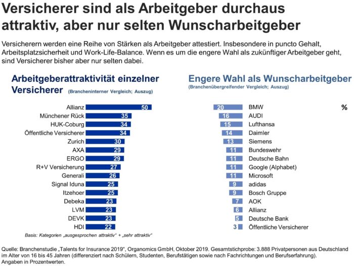 Wenn ein junger Mensch seinen Beruf auswählt, kommt die Versicherungsbranche nur selten die engere Auswahl. Selbst Marktführer Allianz kommt nur für 6 Prozent der möglichen Kandidaten als zukünftiger Arbeitgeber in Betracht. Bei anderen Versicherern liegt die Quote der Interessenten sogar nur bei 3 Prozent. Zu diesem Ergebnis kommt die aktuelle Studie „Talents for Insurance 2019“ des Beratungsinstituts Organomics auf Basis eines Branchenvergleichs.