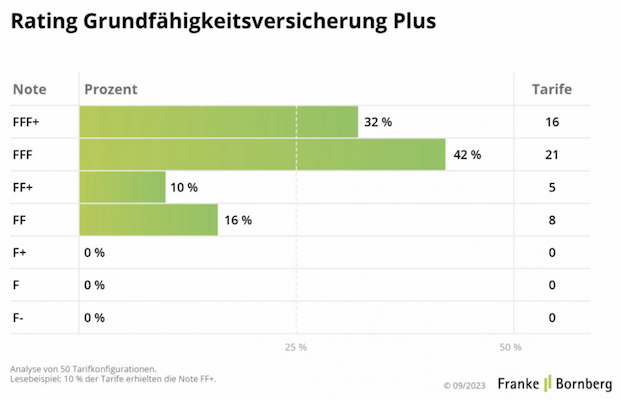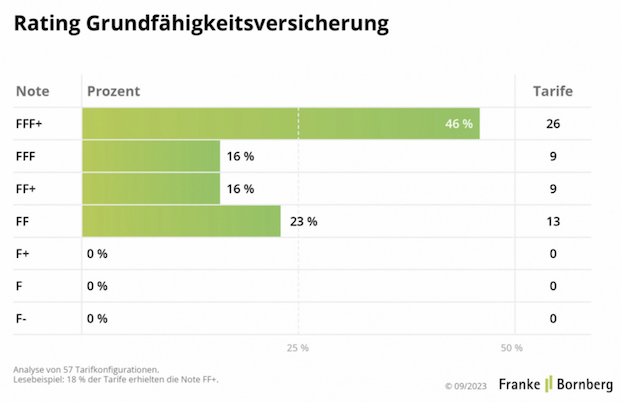 Zunächst ein Blick auf die Zahlen: Im neuen 2023er-Rating zu den am Markt verfügbaren Grundfähigkeitstarifen (Stand September 2023) erhalten 26 von 57 untersuchten Tarife die Bestnote FFF+ (46 Prozent), im sogenannten „Plus“-Rating gelingt das 16 von 50 Tarifen (32 Prozent). Zur Erklärung: Tarife der Plus-Variante bieten Zusatzbausteine mit Versicherungsschutz bei schweren Krankheiten. Übergreifend wurden somit 107 Tarife mit 3.970 Produktkombinationen von 27 Gesellschaften auf Herz und Nieren geprüft.
