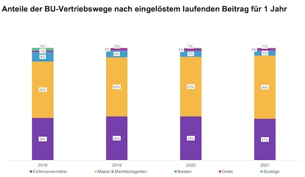 Insgesamt lösten die 84 in der Studie analysierten Versicherer im Jahr 2021 laufende Beiträge für ein Jahr in Höhe von 4,2 Milliarden Euro ein. Davon entfielen 466 Millionen Euro (knapp 11 Prozent) auf BU-Produkte. In den vergangenen Jahren sei das Neugeschäft mit der BU-Absicherung kontinuierlich gestiegen, berichten die Studienautoren. Maßgeblich daran beteiligt seien Makler und Mehrfachagenten. Mit 262 Millionen Euro erzielten sie einen Marktanteil von 56 Prozent im BU-Neugeschäft (2020: 53 Prozent). Einfirmenvermittler kamen mit laufenden Beiträgen von 172 Millionen Euro auf 37 Prozent (2020: 39 Prozent).