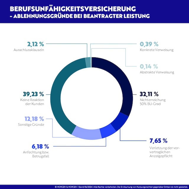 Auch bei den Gründen, aus denen Versicherer einen Antrag auf BU-Leistung ablehnen, hat sich nicht viel geändert. Der Abbruch in der Kommunikation durch den Versicherungsnehmer steht mit knapp 40 Prozent weiterhin an der Spitze und ist sogar gegenüber dem Vorjahr noch leicht gestiegen. Das Nichterreichen eines BU-Grades von 50 Prozent ist mit rund 32 Prozent der zweithäufigste Grund.