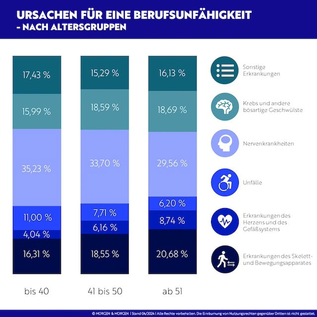 Hauptursache für eine Berufsunfähigkeit sind nach Daten von Morgen & Morgen weiterhin Nervenkrankheiten mit einem Anteil von 34,3 Prozent. Erkrankungen des Skelett- und Bewegungsapparates sind auf Platz 2 bei knapp 20 Prozent der Fälle die Ursache.