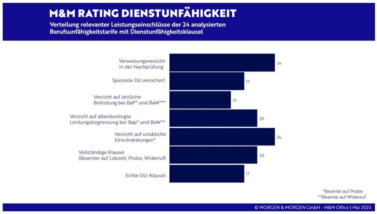 Das Ergebnis kann sich wirklich sehen lassen: Von 24 Tarifen für Berufsunfähigkeitsversicherungen (BU-Versicherung) mit Dienstunfähigkeitsklausel (DU-Klausel) erreichen 15 die Spitzennote beim Analysehaus Morgen & Morgen. Denn das hat nun zum zweiten Mal BU-Tarife mit DU-Klauseln einem Test unterzogen.
